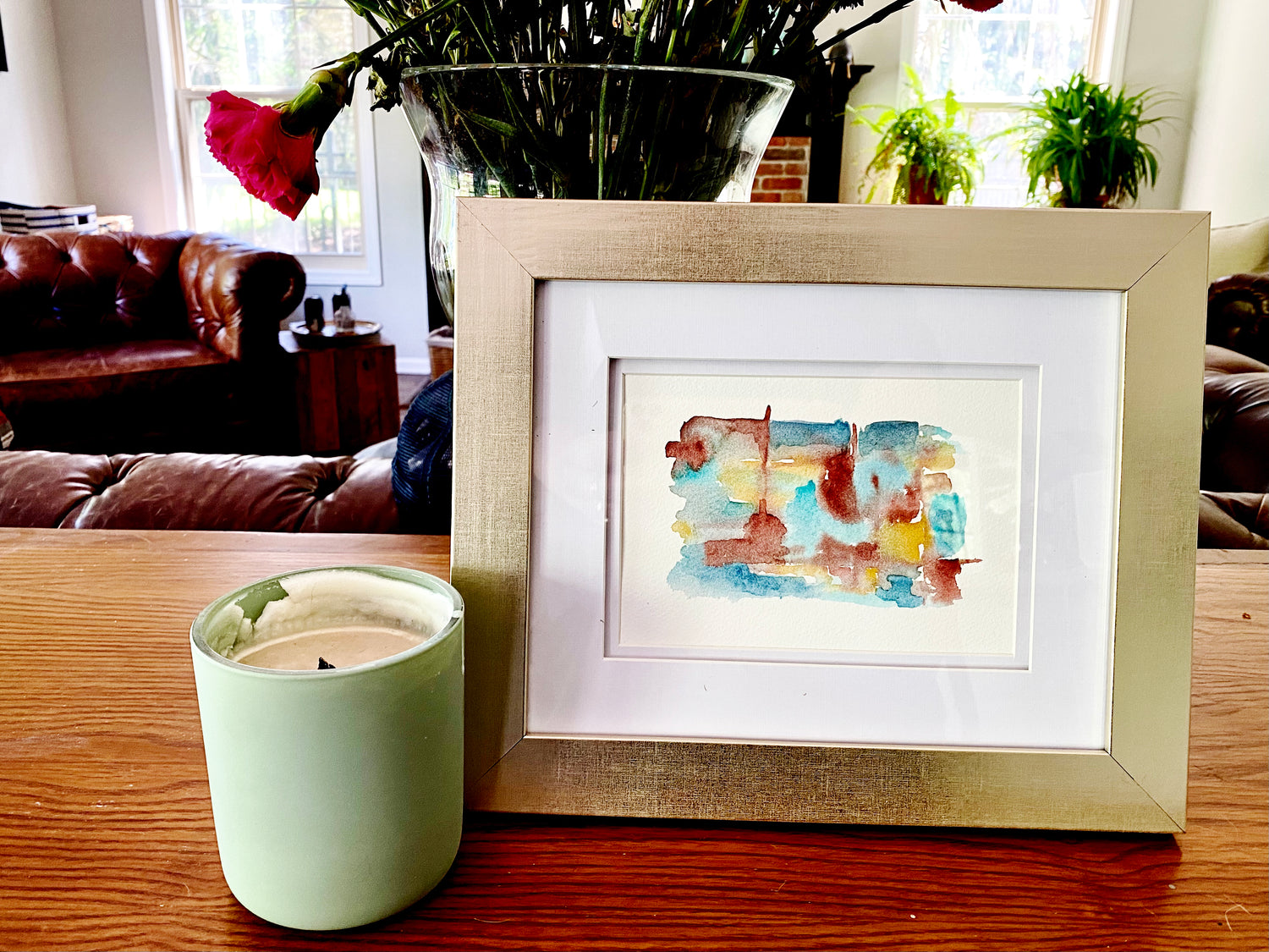 Handpainted, contemporary, abstract watercolor by Ohio artist Raymond McKenzie on fine art paper. Double matted framing measures 10”x14”. Perfect size for home decor and art collectors of all budgets.
