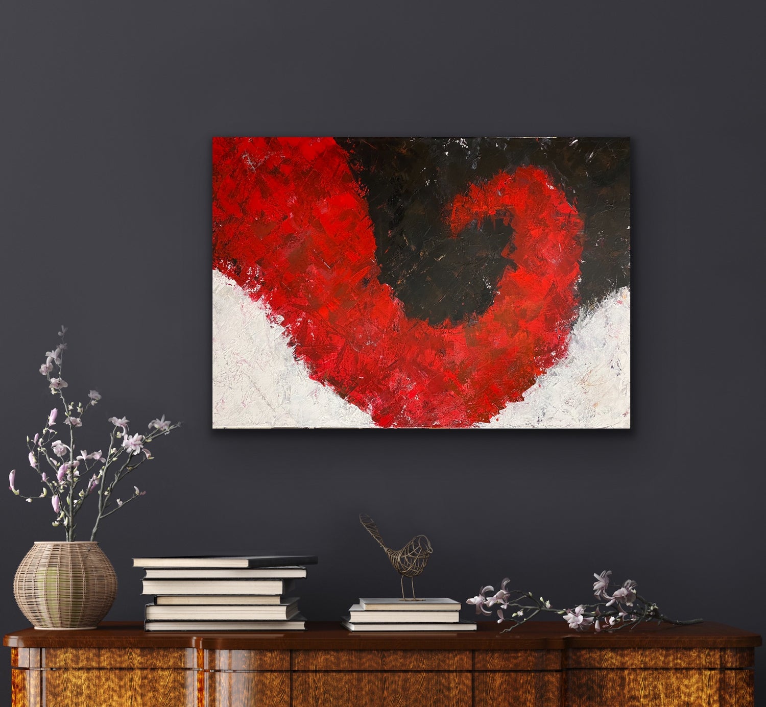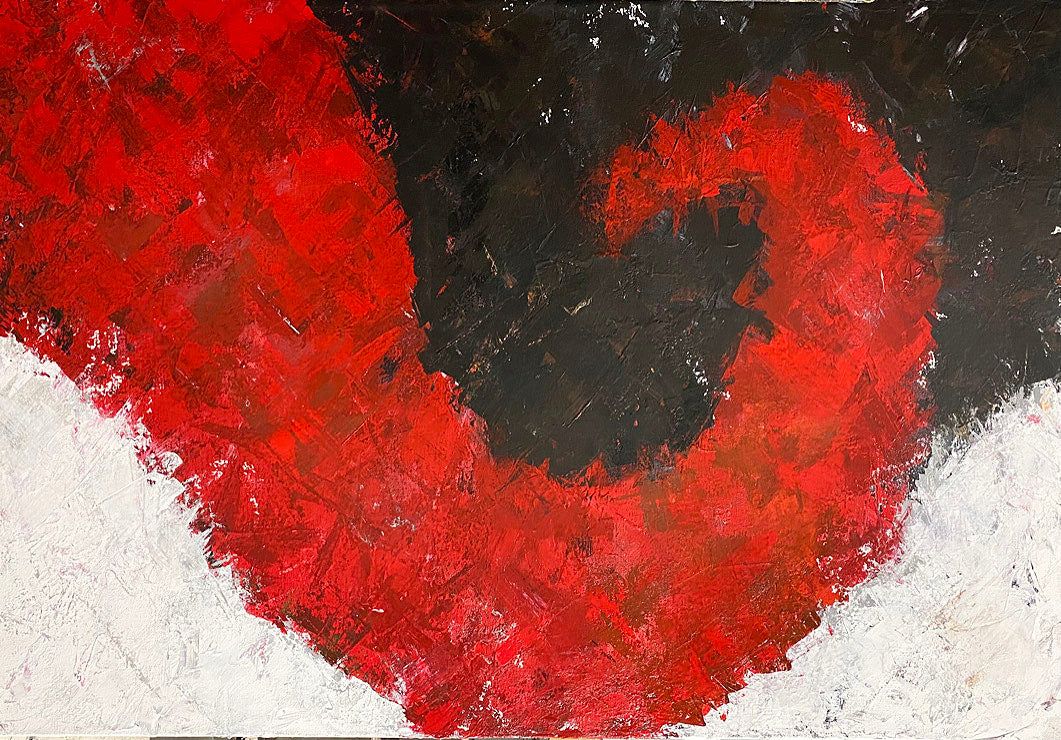 Red Nautilus Rising Acrylic Abstract Painting uses simple palette of 3 colors in this fluid composition.
